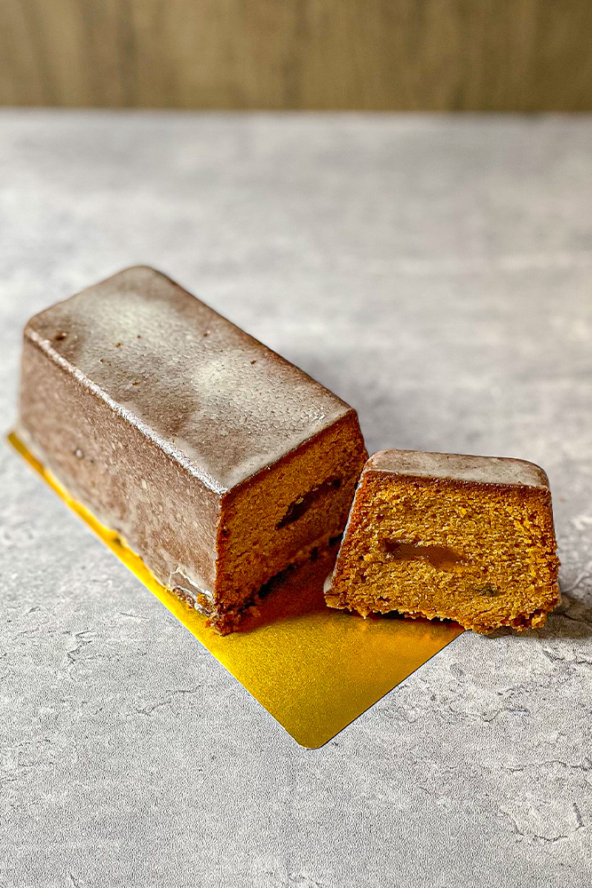 キャラメルの米粉生地に刻んだ杏のパートドフリュイを入れて焼き上げたグルテンフリーのパウンドケーキです。