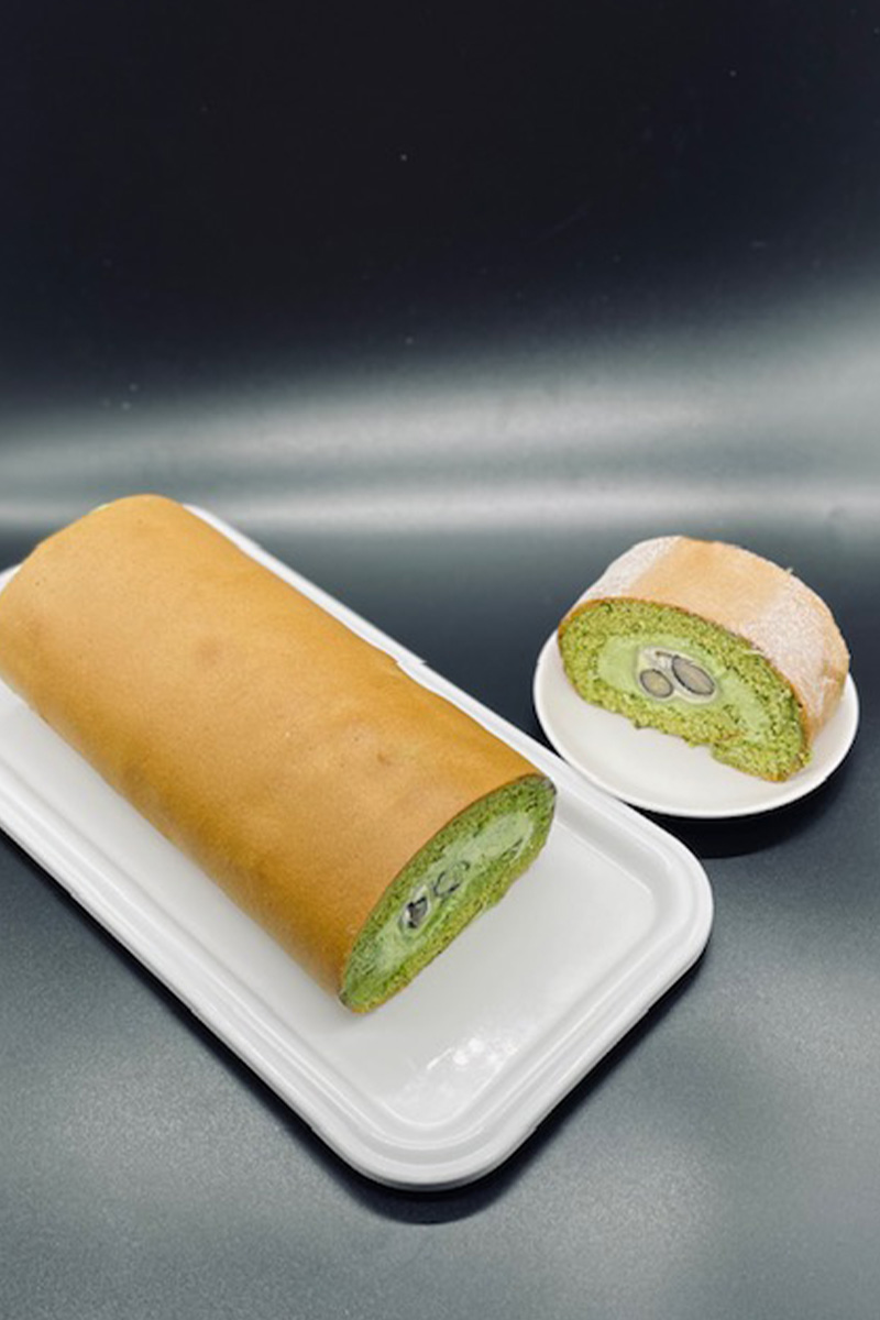 黒豆入りの求肥を抹茶の生クリームと抹茶の生地で巻いた今までありそうでなかった珍しいロールケーキです。