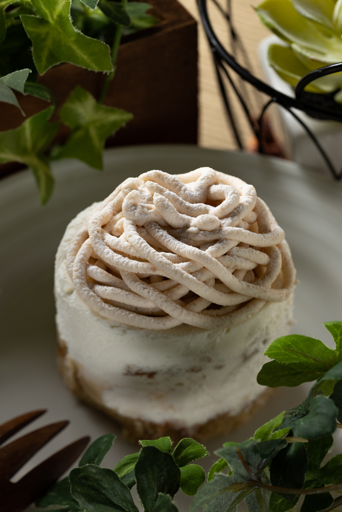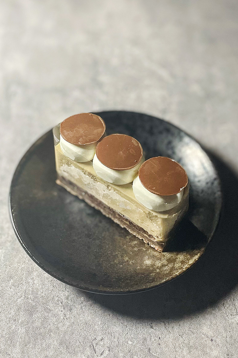 絞った生クリームの中にキャラメルソースを忍ばせ、コーヒームースとジャリジャリとした食感のミルクチョコクランチを合わせました。