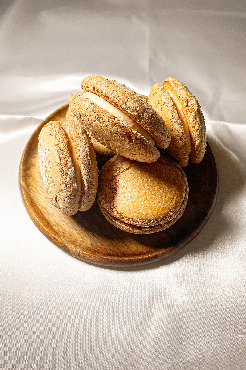 自家製プラリネペーストを使ったバタークリームをふわふわ生地でサンドしたナッツの香り漂うブッセです。