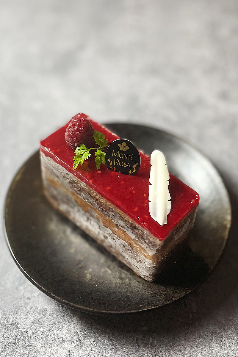 ふわふわのチョコスポンジにフランボワーズのガナッシュとチョコムースを重ねた一品。
