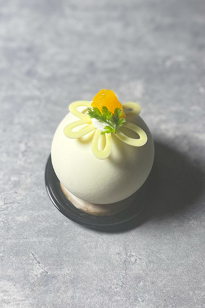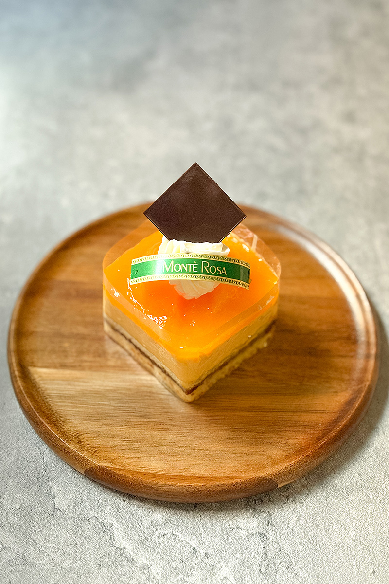 オレンジ香るパンドジェーヌの生地に香ばしいプラリネガナッシュとアプリコットクリームを重ね、アプリコットとオレンジのコンポートを流した、瑞々しさと重厚さの両方を兼ね備えた一品です。
